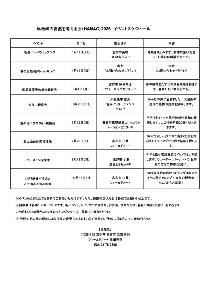 岩手県内各地を舞台に宿主が主催する自然観察会『早池峰の自然を考える会 (通称:HANAC)』